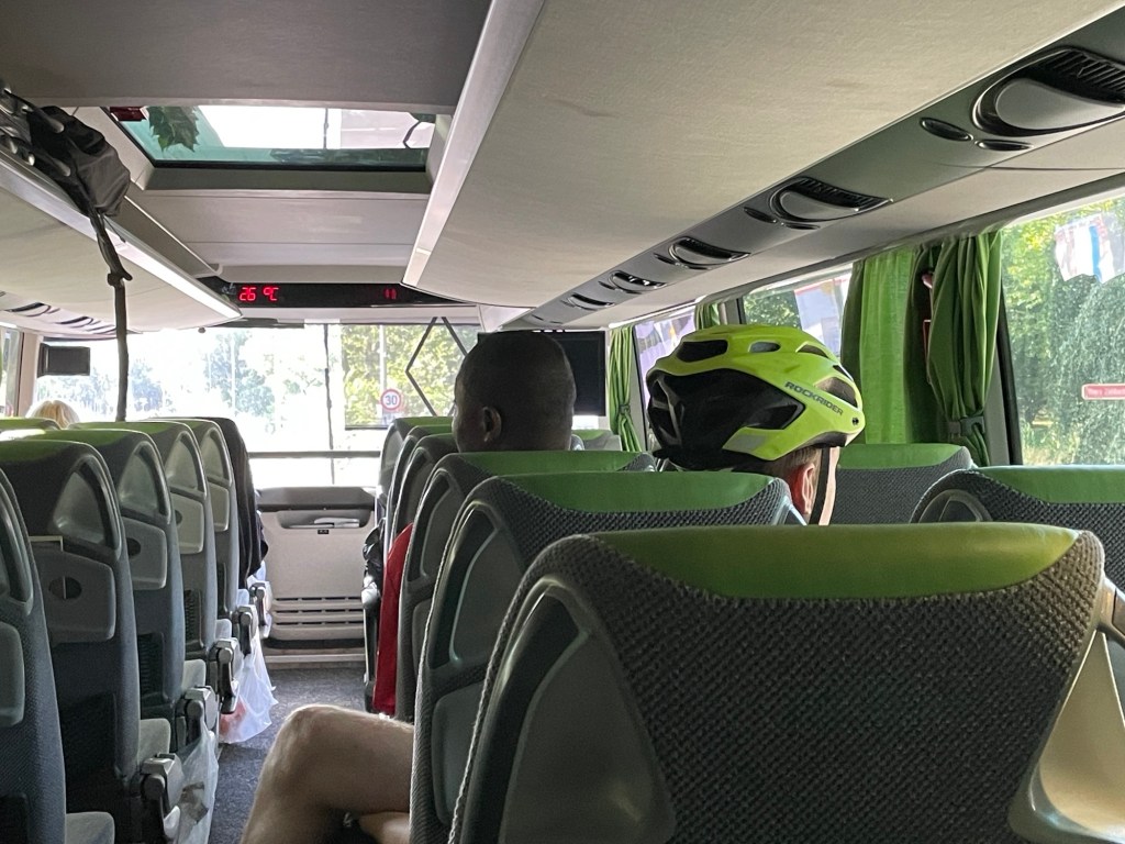 Nach elf gemütlichen Kilometern durch Paris, vorbei an der Opéra, am Louvre und an der Notre Dame, verfalle ich in den Panikmodus. In einer Viertelstunde ist Abfahrt, aber ich komme nicht durch. Absperrgitter und Umleitungen. Nachwehen der Olympischen Spiele. Muss improvisieren. Trage mein Rad eine lange Treppe hoch. Alles dicht. Kamikaze-mäßig durch einen Park. Frage Passanten. Ein junger Typ kennt eine Abkürzung. Vorbei am Spielplatz, links halten. Plötzlich rolle ich in eine große Unterführung. Etwa 20 Busse schnaufen da. In meiner Hektik überfordert mich sogar die Anzeigetafel. Stürme auf zwei Busfahrer zu: Francfort??? Vingt-sept! Da ist das Gate. Ich pese durch den dunklen Schacht und werde schon sehnsüchtig erwartet. Zwei andere Biker aus Deutschland sind auch mit ihren Rädern unterwegs. Steigen aber früher aus als ich, daher soll mein Rad zuerst befestigt werden. Der Busfahrer zieht schwarze Gummihandschuhe über und hebt die Räder auf den Träger. Ich bin so erleichtert. Darauf erstmal ein bisschen Bananenbrot und Schoggi.