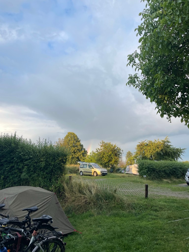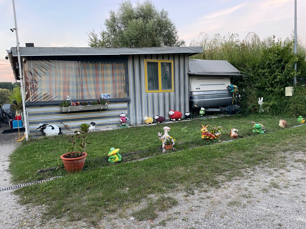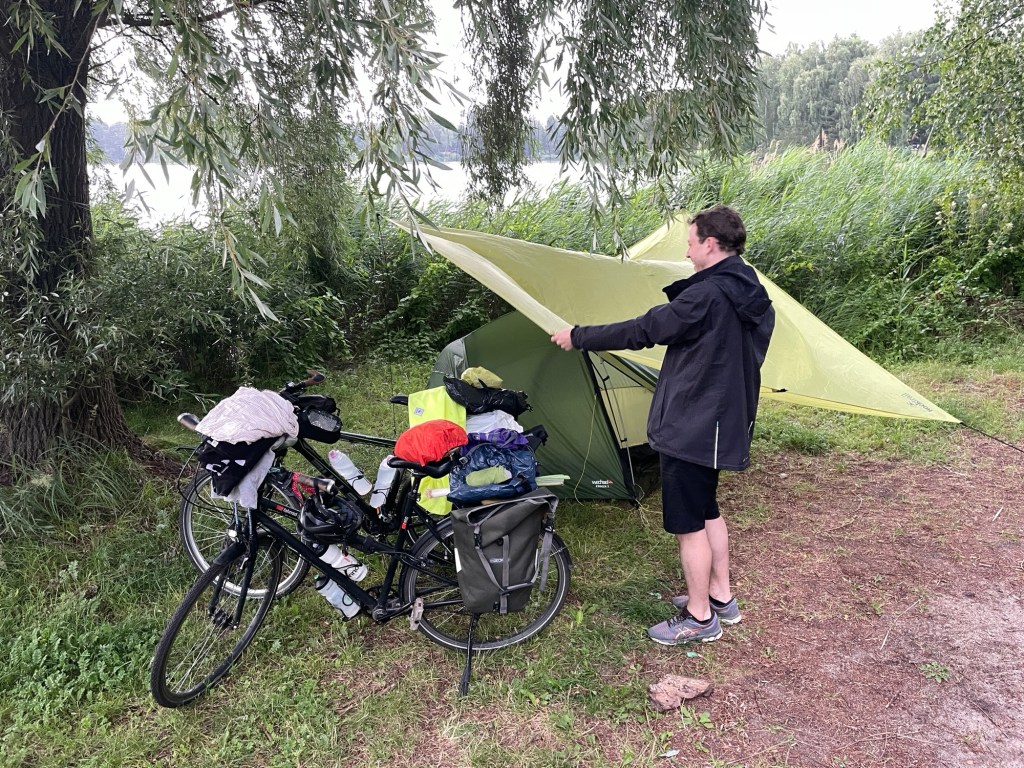 Ich kämpfe! Die Beine sind schlaff und der Kopf hat den Tourmodus aus dem Sortiment genommen. Hinzukommt die permanente Versuchung: die Bahngleise sind nur einen Gestrüpp-Wall entfernt. Aber nein, Zähne zusammenbeißen. 70, 80, 99 Kilometer. Irgendwie schmelzen die Kilometer und das Schild „Rezeption“ taucht auf. Matsche, aber happy – angekommen beim Campingplatz in Philippsburg. Liegt zwischen Mannheim und Karlsruhe. Wäre ich wohl niemals extra hingefahren, kann ich aber jetzt wärmstens empfehlen. Es gibt einen schönen See, einen Automaten mit Spaghetti-Eis und vor allem einen herzlichen Gastgeber, der mir sogar einen Stuhl ans Zelt bringt. Eigentlich war der Platz sogar ausgebucht, ich darf ausnahmsweise auf dem Rasenstück eines Dauercampers pennen. Glückssträhne!