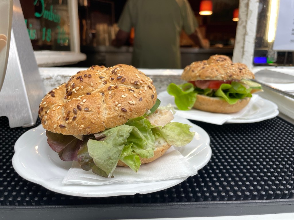 Nach sieben Kilometern meldet sich schon der Magen. Appetit! Ruft er. Das Frühstück ist verpufft. Wie gut, dass ein Gasthaus zufällig Fischbrötchen anbietet – mit Forelle und Meerrettich-Preiselbeeren-Creme. Zack, verschwunden.