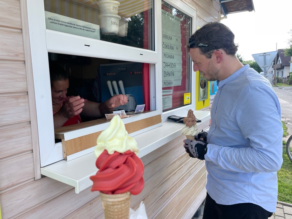 Die Energie kommt zurück. Was tun? Noch 30 Kilometer bis Prag. Fahren wir mit dem Zug oder mit dem Rad weiter? Wir entscheiden uns fürs Strampeln. Mit Zwischenstops. Zum Beispiel beim Softeis-Stand. Davon gibt es fast an jeder Ecke welche. So gut. Wieder nur 1,80 für diese Schönheiten. Micha zahlt mit einem Tausender (etwa 41 Euro). Nix Kleingeld. Die Verkäuferin blättert das Wechselgeld hin. Wir schlecken und ziehen weiter.