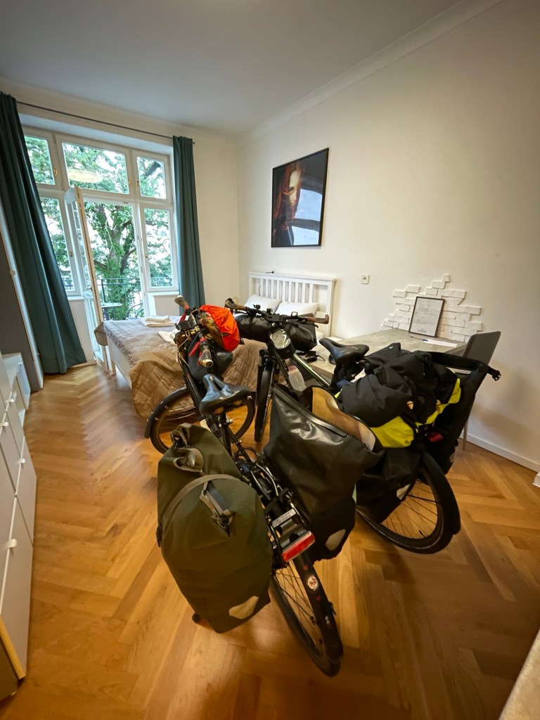 Wir rollen mit Abendsonne im Rücken in Prag ein. Erster Eindruck: super lebendig. Aber bevor wir darauf anstoßen – na klar, mit einem perlenden Pivo – geht es ins Airbnb. Räder mit in den Aufzug und die Bude auseinandernehmen: Zelt trocknen, Schlamm wegspülen, Geräte aufladen. Ein kleines Paradies, sogar mit Waschmaschine.