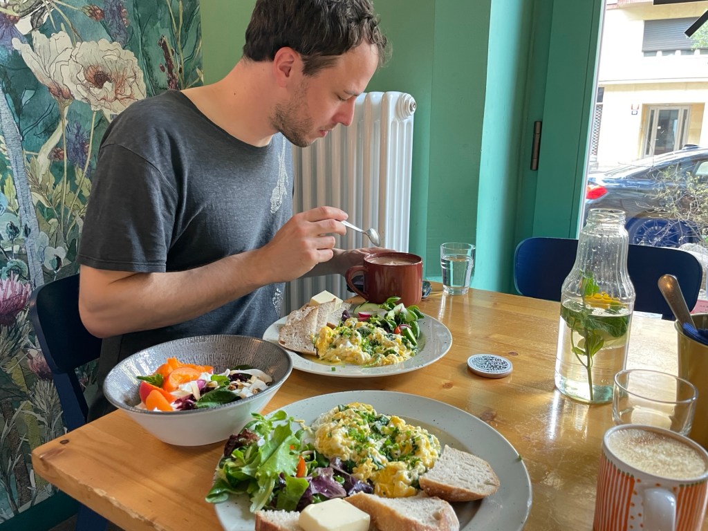 Das Frühstück ist sehr fein: schlonziges Rührei mit Spinat, Brot, Salat, dazu Joghurt und einen Topf heiße Schoki und Latte Macchiato.