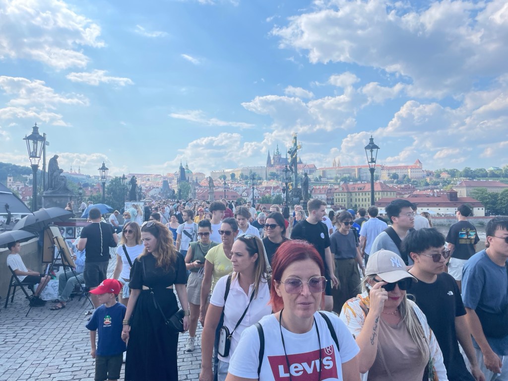 Aber erstmal Prag entdecken. Zu Fuß, nur mit Lenkertasche. Vorbei an imposanten Gebäuden mit Verzierungen in jeder Ritze. Die Hauptfarben: Ocker, Eierlikör, Sand. Hier steckt Geld. Alles sauber, kein Müll, keine Urinnote – wie in anderen Großstädten. Dafür sehr, sehr viele Touristen. Und Junggesellen-Truppen aka wilde Männer-Horden.