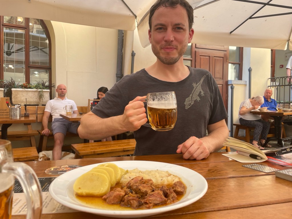 Das schreckt uns etwas ab. Wir verschanzen uns in einer Brauerei und schlürfen einen Humpen Bier: „Pilsener Urquell“. Das heißt hier wirklich so. Im Magen ist auch wieder Platz – für ein tschechisches Gericht: Schweinewürfel, Weißkraut und Knödel. Nebenbei spielen wir Karten und sind minimal beduselt.